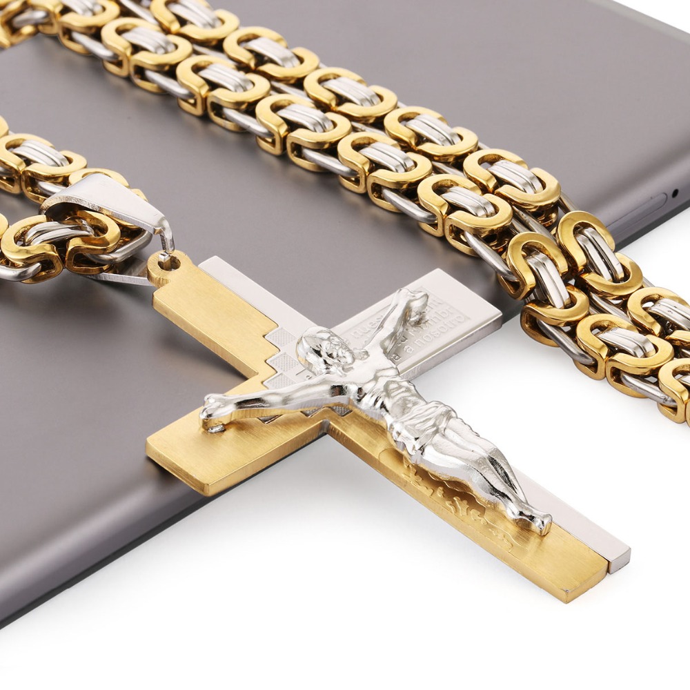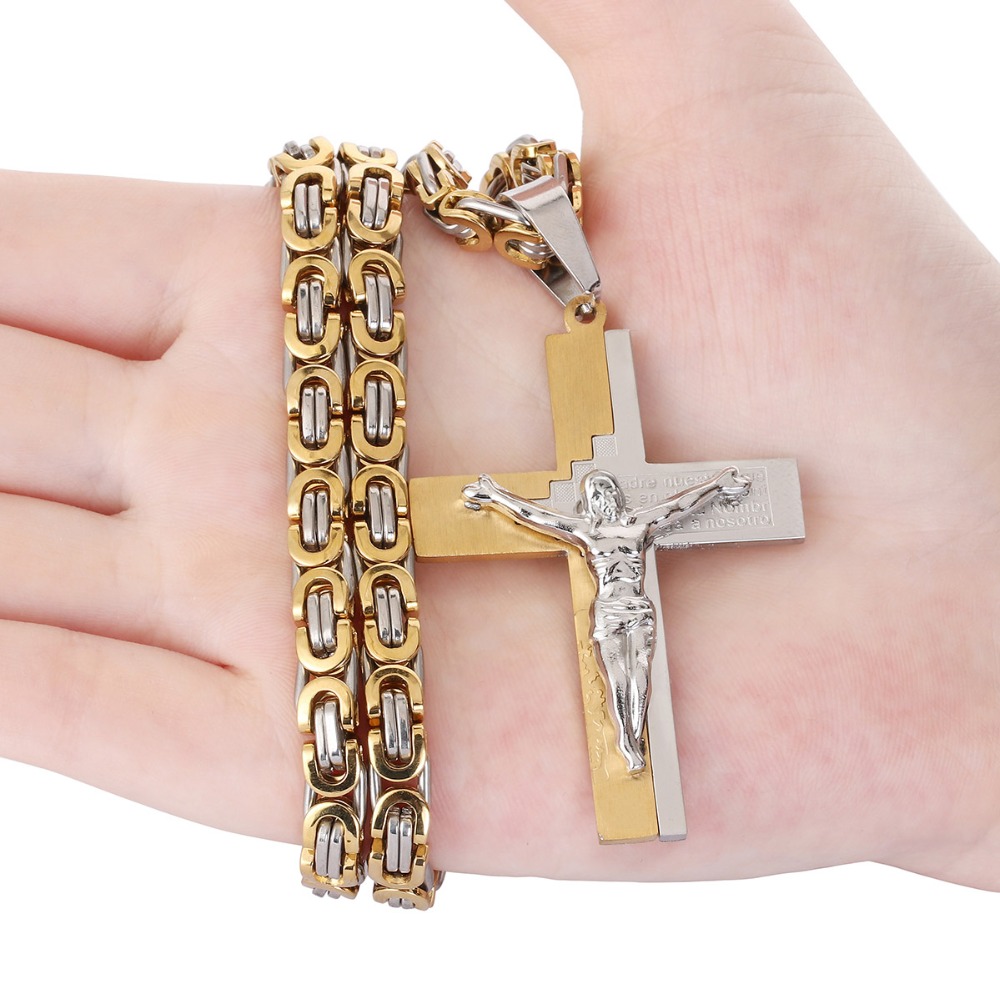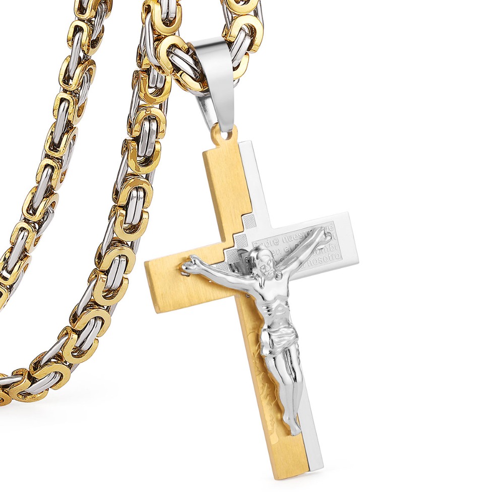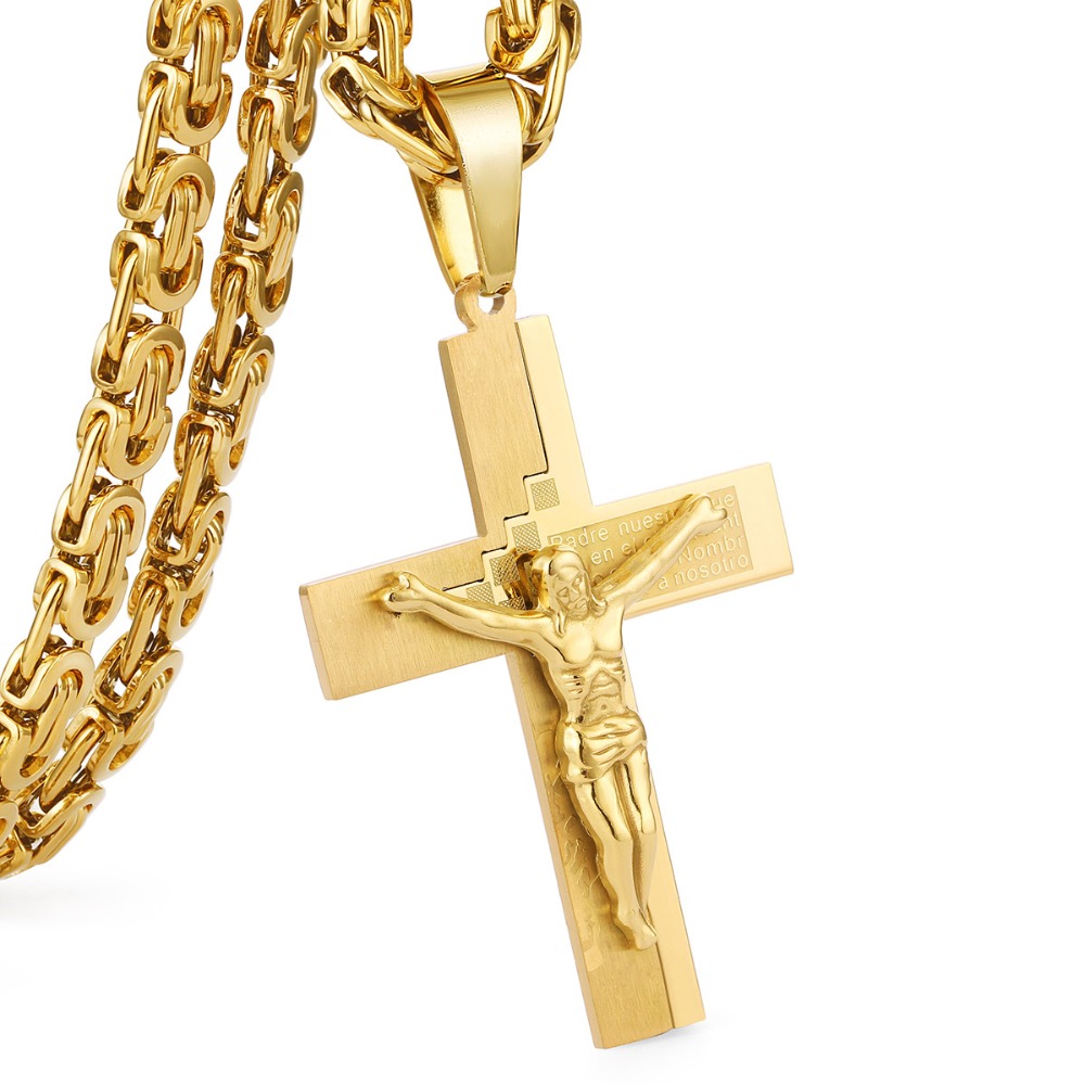 - Name: Crucifix Jesus Pendant Necklace Gold Color Stainless Steel Christs Bible Cross Men Jewelry Byzantine Chain Gift for Father