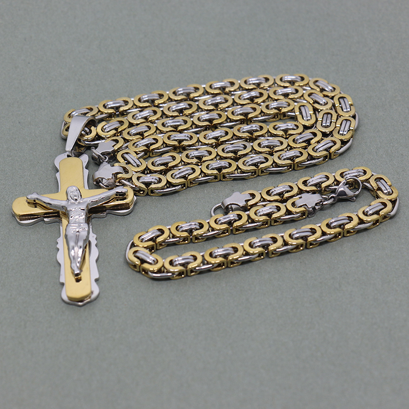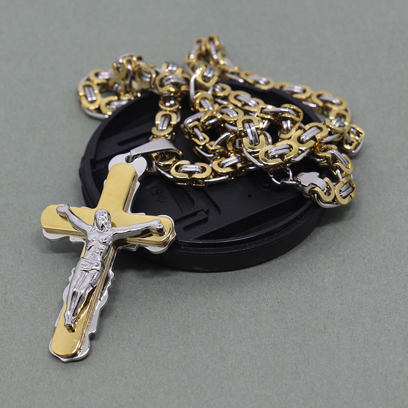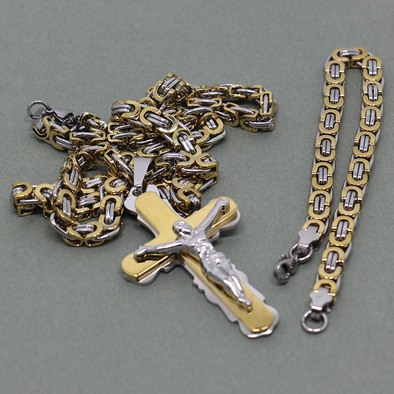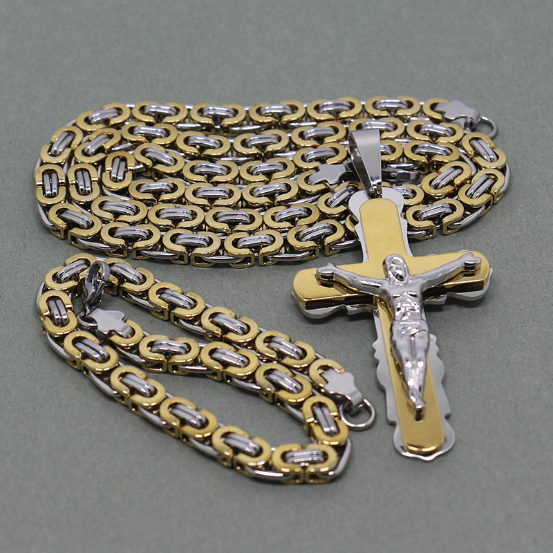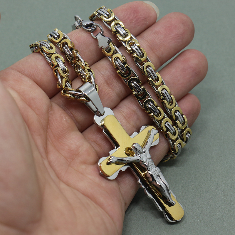 - Name: Multilayer Cross Christ Jesus Pendant Necklace Stainless Steel Link Byzantine Chain Heavy Men Jewelry Three-piece suit