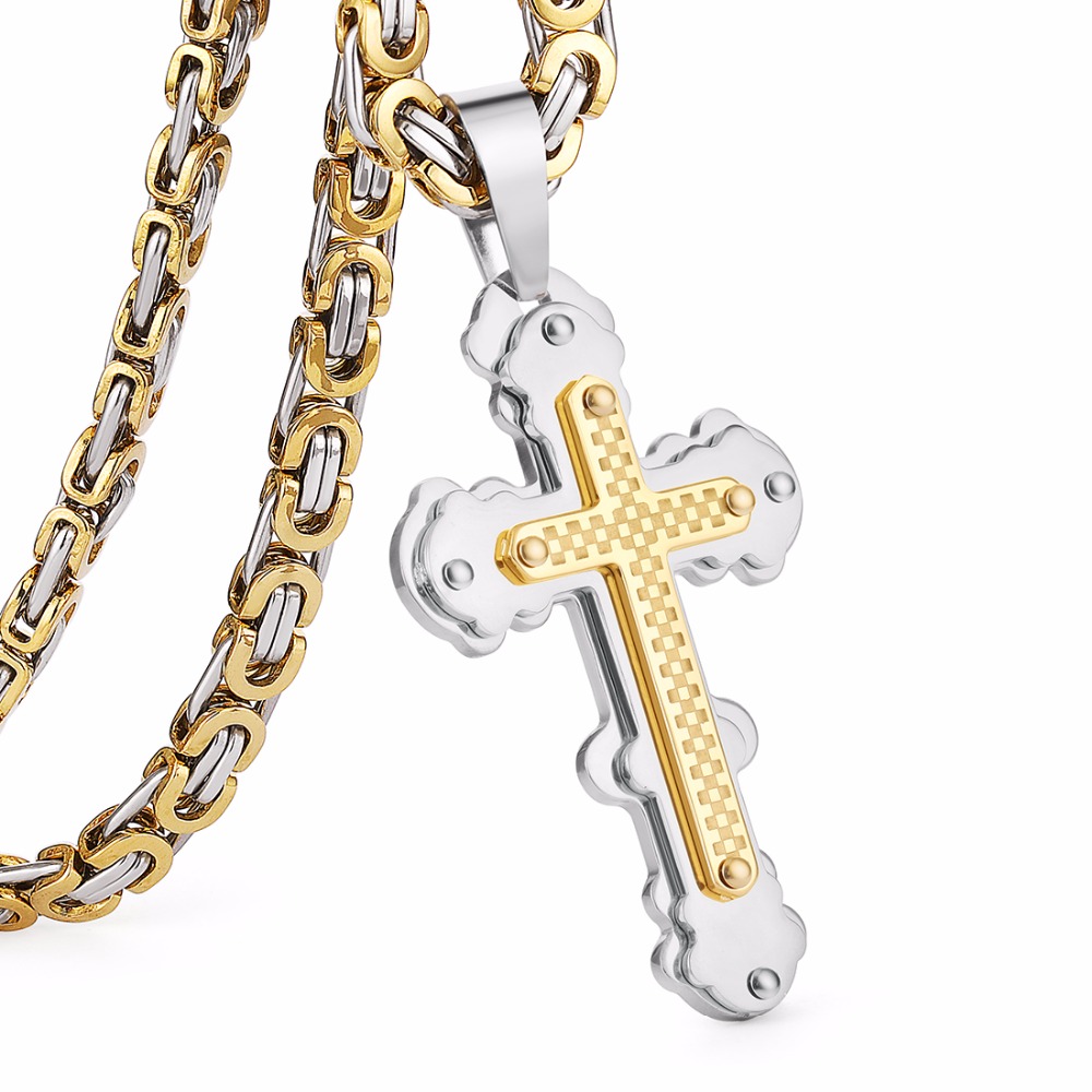 - Name: Jesus Cross Pendant Necklace Stainless Steel Men Jewelry Byzantine Link Chain Poplular Christian Colar Sliver Gold Color
